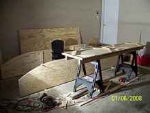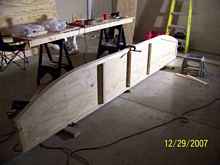The chine logs and stiffeners were 1 X 2 pine. Notice that I cheated and cut the curves in 1 X 4's with my jigsaw instead of doing any board-bending. |