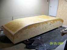 After righting, the fore and aft decks were fabricated and attached. It looks like a real boat at last, and kinda nice in natural wood finish. Maybe I won't paint it for a while. |