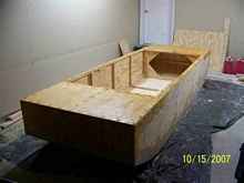 I built frames for the bow and stern panels, and glued and screwed them in place. I built a framework for the floor using 2 X 2 fir, and a 1 X 2 over a 1 X 4 for the center rib where the two bottom plywood sheets would attach together.