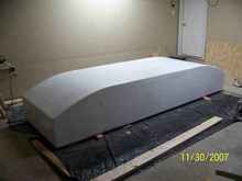 Turned upright, I painted the inside and decks the same way, and reinstalled the landing gear. I mounted blocks on the nose to catch under the front lip of my pickup truck bed to hold it in place. |