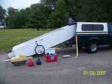 Note the fiberglass case that hold the Evinrude 3. Believe me, the boat barely fit, and the fact that I could self launch this #250 boat says how dedicated, strong and stupid I was. I was diagnosed with “anti-traileritis a few months later. Also note the yellow belt around my pickup bed that I used as a boat retainer. Yes, it can be done.
