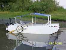 I also built the retractable landing gear using 2 X 2 X 1/8 square aluminum tubing and 20 inch #150 rated garden cart wheels. The boat's framing was designed to have strong points for this attachment. This makes it hand-launch able like a big wheel barrow.