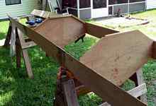 Once the panels are cut out. it’s out to the driveway to apply fiberglass buttstraps (the Dynamite Payson technique) to assemble the full size topside, bottom, and bilge panels. |