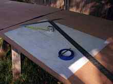 I screwed together 2x4s to make two boards 20-feet long and set them on sawhorses and then set on top two and half sheets of the plywood, in this case meranti marine ply. The panels were temporarily taped together. This enabled me to lay out the bottom, topside and bilge panels working at a comfortable height instead of crawling around on my hands and knees on the ground. The four-foot T-square helps plot the right measurements. |