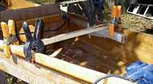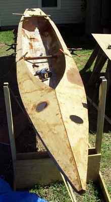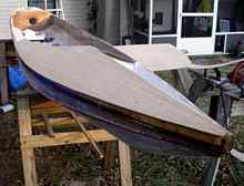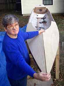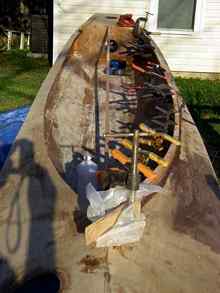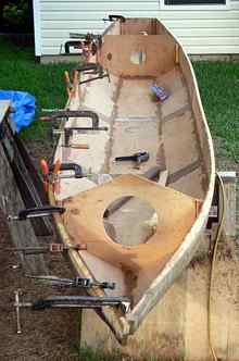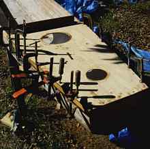 A sheet of ply is clamped and propped in place so the aft part of the deck can be marked. The total length of the deck from the bow to the end of the cockpit was a hair over 16 feet, so two butt straps were needed on each side. |