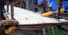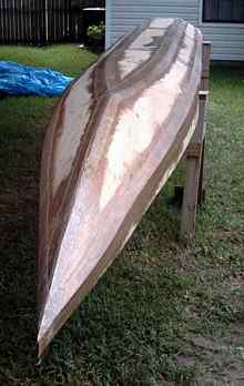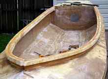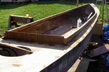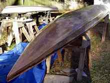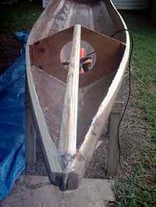 Extra glass was applied at the forward part of the bottom, where extra abuse is likely during beaching. An epoxy soaked rope was applied down the leading edge of the bow for extra abrasion resistance, and then glassed over. |