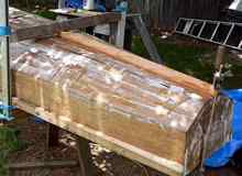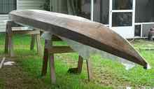 The actual glassing of the hull had its own mini-disaster. I use one of those yellow auto body putty squeegees to spread the epoxy on the bottom and bilge panels and a brush on the vertical topside panels. I had most of the glass on and a so far wrinkle-free job when the pressure of using the squeegee pushed the stern of the boat off the sawhorse and it rolled over and fell on the ground. I would have cried, but quick action was needed. I got the boat back on the sawhorses and most of the glass back in place. There were a few puckers and some dirt and grass but overall I was lucky. |