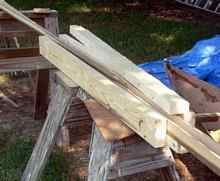 The gunwale reinforcements were next. I had some nice tulip poplar left over from earlier projects, but it wasn’t 20 feet long. This simple jig let me cut scarfs in the wood so a sufficient length could be glued up. |