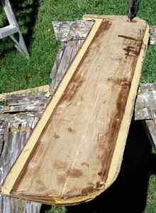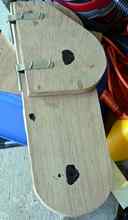 The gaps at the leading and trailing edges are filled with thickened epoxy. The three 4 mm layers plus the two quarter inch (6 mm) strips gives a finished thickness of one inch and the curved outer layers give exceptional stiffness to the board. An eight-inch piece of epoxy soaked Dacron rope is attached to the leading edge for abrasion resistance and after final fairing the board is glassed. It’s not necessary but I filled the hollow board with epoxy, which will probably give it negative buoyancy. If it weren’t filled with epoxy, the pivot bolt hole would have to be sealed with thickened epoxy to prevent the board from filling with water during use. |
