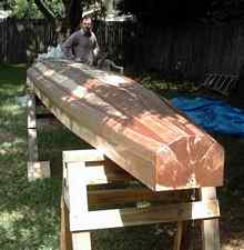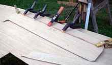 Next, two outer layers are cut. These are not full width, but rather are set back from the leading and trailing edges; about a half inch from the leading edge and a inch from the trailing edge. These pieces are lined up on either side of the center piece and the leading and trailing edges clamped and glued into place with thickened epoxy. The side pieces are bent over the quarter inch strips, which gives the board a fair, wing shape. |
