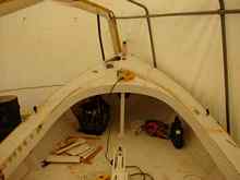 The first parts in were the fore and aft bulkheads screwed and epoxied in place with jig to maintain shape.