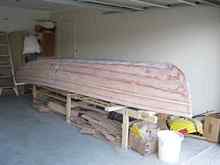 Rogue is intended as a sailing boat that will row or outboard motor fairly well so she has long slim lines as this shot shows. Graeme has her all ready to paint here, the taped chine and filled seams will not show at all when covered. |