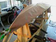 By May 9th I was ready to make the bottom. I used 3/16" birch plywood. This concerned me a bit though my stitch-and-glue book acknowledged people successfully used it. I love the way this ply looks, and also liked the lightness. But the veneer layer is very thin, and once it is broken on either side there is virtually no strength. So far it has worked out very well though. I made paper patterns.
