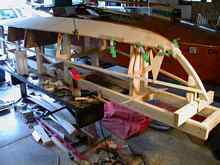 At any rate, with the bottom pieces cut as nearly to shape as was safe, I glued them on. This was fun, as the curves of the boat started to move from imagination to the visible realm. I coated the insides with epoxy completely, and then the contact areas on the frame. I put 3/8" brass woodscrews in every foot or so, just to use as clamps, later removing them and plugging the holes, so only trouble spots needed extra clamps.