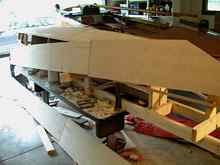 After a massive cleanup of the whole garage area (did I mention I have a patient wife?) I took the hull off, cleared the table, and set it upright on some carpet strips. I was delighted with the lines.
