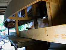 One of the most enjoyable days was May 18th, taking the boat off of the strongback. Fortunately I'd remembered, before gluing on the sides, to break all points loose from the attachment vertical 2x4s where glue had dripped onto them, and also break the temporary formers loose all around. I also removed the screws from the vertical 2x4s to the ribs before putting the sides on at any point where they would be difficult to access afterwards. So early that morning I started removing the wood screws through the formers into the stringers, and then removing the screws from the upright 2x4s to the ribs, to the point where the hull was free and just sitting on the remaining uprights.