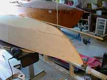 My issues with the scarfing jig were a) my circular saw blade didn't quite go through both layers, and more importantly b) I got curves in the joint because the plywood wasn't completely clamped down across the full width. I figured out how to address this about the time I was done making the sides. Once the scarf joints had set, I clamped the bottom pieces on and marked for the cut to within 1/8" or so of the actual shape. One of the surprises I'd noticed when shaping the keelson and stringers was that along the keelson, I could use a completely straight edge from the transom almost to the stem, leaving a small curved gap (clearly visible in Figures 17 and 20 below). So I decided to stay with that "plan", later making a filler out of plywood aft of the daggerboard trunk, and continuing the mahogany piece that completed the stem back to the daggerboard trunk to fill that gap (more below). Marking and cutting was simple along the chine, and really simple along the keelson except for the last bit of the bow.