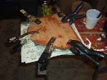 thickened epoxy and covered with fiberglass tape soaked in epoxy,