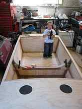 This is the finished boat, sitting on supports in the back yard. The flat sides and curved forward panels come together well, and the boat has a good working look to it, not an accident. With dry storage and ample under seat volume, Michael's family can enjoy a day on the water without the hassle of what to bring and where to store it. |