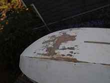 Her next home was an obscure patch of yard in Hood River Oregon. That house is a half mile from the Columbia River, and with the cartop loaded down with kayaks and windsurfing gear, she fell into disuse and neglect. As the kids went off to college, she grew a cloak of ivy, the gunnels and skeg rotted, and 2 years ago a family of partridges made a home under the protection of her inverted hull. It seemed a fitting end for a tender. When the partridges moved on, I hauled her up onto a pair of saw horses to poke at her hull and frame - curious to see how far the rot had progressed before making the long sad trip to the landfill. The sacrificial gunnels and skeg - white pine fastened on with bronze ring nails - had rotted away. The hull and frame, AC exterior plywood, West System Epoxy and cloth using the methods described in Harold Payson's "Build the New Instant Boats" were completely sound. I poked and scraped, looking for a reason to let her go - but couldn't find a thing. As a Scotsman, I will neither throw away a perfectly good boat nor pay someone else to deal with problems caused by my own neglect. She needed a new coat of glass on the bottom, new gunnels and a skeg, and a coat of paint. I had it to do.