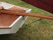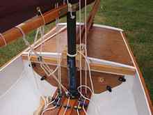 I was happy with the modifications and sailing qualities, but my son suggested that I add some reserve bouyancy. I wasn't all that concerned about getting in big trouble out on the river with my pfd and all the spectators on shore every time I sailed, but I didn't want to constrain my sailing to public places, and it goes against the grain to design and build a boat that I can't self-rescue. So this past winter I modified the transoms and added sealed compartments fore and aft. I haven't yet sailed her fully swamped, but when the weather gets a little warmer that's an experiment I'll try.