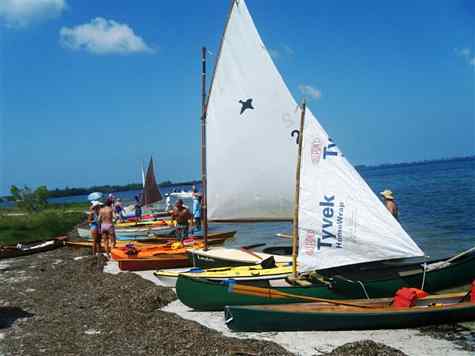 The big (by Scuzbum standards) yellow sloop is a camp cruiser and utility skiff designed and built over 50 years ago by Joe Dobler, who later imported stitch-and-glue technique from the UK, and popularized it in the U. S.