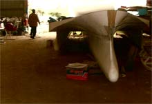 In Nha Trang I stumbled across a fiberglass shop and piled outside - fiberglass coracles! Our driver got me inside, a Robb White nostalgia moment, not the sweet smell of 1/2 pint to the gallon old outboard exhaust, but the strong stink of polyester resin. These guys were busy. Coracles, bath tubs, inboards, outboards, wave piercing cats and tri's, it was like South Florida 40 years ago. We can make anything! I saw the mold for the coracles and found a finished product out back. Note the wide molded gunwale with molded in pad eyes. Somehow gunwale just don't seem right here does it.