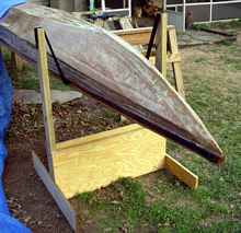 This kayak/canoe stand was built according to the instructions in Canoe and Kayak Building the Light and Easy Way, by Sam Rizetta. It's much better than a sawhorse for supporting a canoe or kayak that doesn't have a flat deck or bottom. |