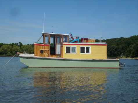 30' LOA 10'6" beam. The hull is two layers of 1/2" ply on the bottom and 3/8" for the topsides covered with 6 oz fiberglass. The boat was launched in the Kalamazoo River at Saugatuck, MI in early June and is slipped there at the moment. m 've used it on Lake Michigan, but only when calm, and the shallow draft allows me to travel about an hour and a half upstream through marshes. It's powered
