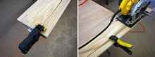 After cutting a couple feet into the board, stop cutting, allowing the blade to stop spinning completely before moving the saw, and attach a clamp near the beginning of the cut. This will keep the cut section from drooping as the cut gets longer into the board. Near the end of the cut, repeat the procedure and add another clamp. At the end, cut through the board before stopping.