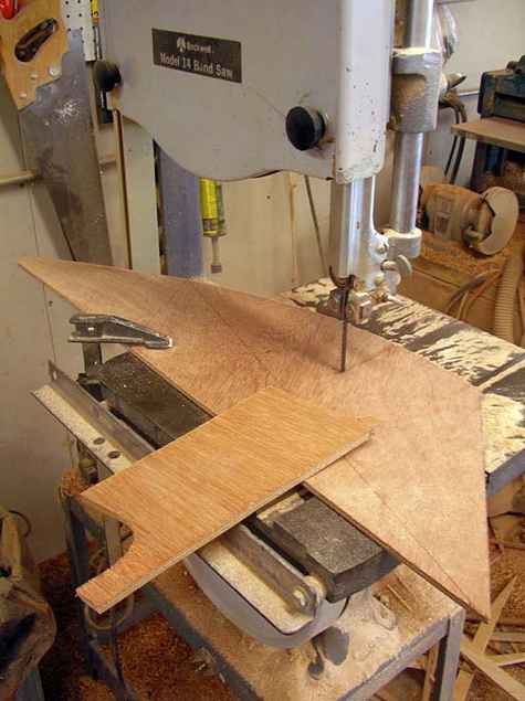 Meranti plywood is a popular boatbuilding material. It is found in marine grades and while heavier than Okoume, it is also stronger, more rot resistant and less expensive. But one of the things that goes with the strength of the stuff is its brittleness. Because of this, it tends to tear out when being cut with a bandsaw, especially across the grain. One way to minimize this is to clamp a scrap piece of ply to the table as shown in the picture.