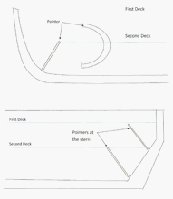 In the largest ships, pointers are used wrapping themselves around the bow and stern frames, shaped somewhat like a boomerang, as you can see in the drawing. They strengthen the ends of the ship and lock down half frames in the bow and stern. They run from a deck down to the keelson and back up to the deck on the other side of the keel.