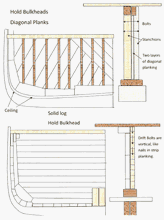 The hold bulkheads are heavy, to prevent flooding and strengthen the ship against hogging. Bulkheads are built with diagonal planking or with butted planking, called solid log. The turn of the bilge also has a different shape to its structure. You can see the two structures butting in the turn of the bilge with a scarf much like a bow scarf.