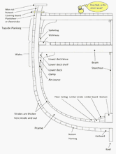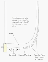 The oak planks were usually 4 inches thick, held in place by 1 3/4 inch trunnels or 1 inch bolts. Two gangs of men worked on the big ships. One gang spiled and scarfed from the garboard up to the wale, the other gang from the wale down and up from the wale to the sheerstrake. For most ships, the garboard plank nearest the keel was left for last so that air could circulate inside the ship. Since ships were built outside in all kinds of weather, sometimes rain or snow could trickle down out the gap where the garboard would be placed. Also, in the days when ships were built by the water, if the garboard were put in first spring tides might float the skeletal ship away.