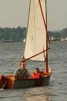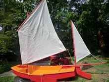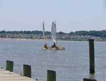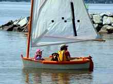 The first boat I took out this summer was the Slam Dink. There is rumor that there was another one built somewhere, but all I know about is this one. It has a traditional double sprit rig. Both a sprit boom and sprit yard which are tied off close together making it easy to adjust the tension. My brother, Sean, (along with Lauren, his cousin) built this boat when he was a kid. It was his first boat build. I took charge of it since I have more room and both my father and he have moved on to other boats. I find this the perfect boat to take young kids out in. It doesn’t have flotation but it is made of wood and will float. In shallow water you can have a kid get out there and really learn how his weight works with the boat. I went to a Memorial Day party and there where about 12 little boys there. For some reason all my friends had boys, and it seems that my daughter is one of the few girls. She will be very popular at future Memorial Day parties.