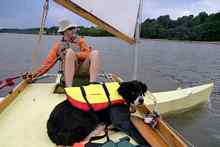And here is my fearless water dog, Petunia, in her life vest she got for Christmas. Sailing this boat is a little like sitting on a front porch. |