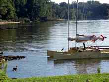 Bill and I had fun camping and sailing. The winds were high and we even had to reef once. I have learned that as soon as the forward hulls start to submarine it is time to take sail in. The sails on Serendipity are larger than the ones shown on the drawings. This makes for good time in light airs but also means she can be over powered in 15 mph of wind.