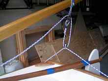 Rigging the boat was more difficult than expected and in the end I had to consult Justin Pipkorn, for whom the boat was originally designed. Between my dumb questions and his erudite answer the confusion was settled and the rigging proved to be both simple and elegant. At the top of the short mast is a small wooden block which can turn freely, it has four horizontal holes which are aligned in the fore/aft direction. The top two holes are for the halyard and the lower two holes are for the topping lift. The halyard has an ingenious mechanism for looping round a holding system made from two pulley sheaves and two penny washers on a piece of threaded rod. To reef the sail the halyard loop is unhitched and fastened on an identical point two foot further up the gunter. This clever system allows the sail, gunter and boom to freely rotate round the mast as required.