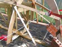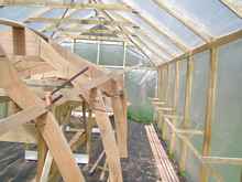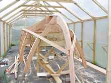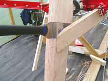 The timber is under a lot of strain and will do a lot of damage to your vocal chords if it hits you, that is if you survive. The rest of the chines will have to be loosely supported, I tied mine to the roof of the shed to hold them out of the way and adjusted the position of the support as subsequent frames were fixed.