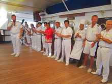 The captain introducing the crew at the start of the voyage |