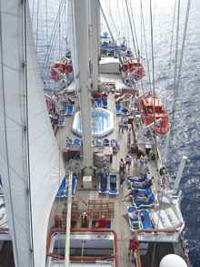 Many people we have met rave about the cruises they have been on, others say they would not go again. For us this was our first cruise, and I must say an enjoyable and memorable experience. Many of the other passengers we talked to had sailed with this line before and also on larger ships. Most of them said they would not go back to larger ships where they felt they were herded like cattle in stampedes to get to the dinning room, to get to the transfer boats for shore and to get back on the ship. When we visited Santorini there were only two medium size cruise ships in the bay, which sometimes takes up to ten. Even with two the queues for the cable car and at the dock side were huge and did nothing to endear us to the idea of a large ship cruise. As a boat builder and sailor I felt that Star Clipper was about as big as I would like to go, and even this was far far bigger than I would aspire to owning.