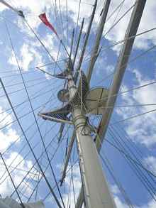 View of the lower and upper crows nest on the fore mast |