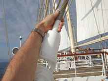 The sails were hoisted by the crew with hydraulic assistance, a couple of times passengers were allowed to hoist a sail manually to get a feel for how hard the work was. There was a trip to the first crows nest on the fore mast, which was a very sanitised experience, guaranteed to be safe and free of litigation for the ship.