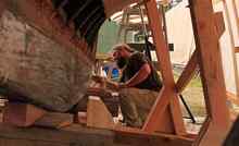 The repairs to this TRUANT class sloop are extensive and great training for budding shipwrights. Student Reid Wilburn is examining the forefoot. |