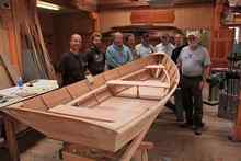 "Wooding" the mystery dinghy. Instructor Sean Kooman, third from right, leads the work. |
