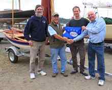 Celebrating the launch of the Pete Culler Yawl boat, and presentation of the first Boat School burgee to proud owner Dr Rich Foa MD, Alumni '11 (second from left) of Annapolis, Maryland. Executive Director Bill Mahler, right, congratulates Rich and gives Graham Cowgill, Alumni '11 a hand with the burgee, while Traditional Small Craft Instructor Jack Becker looks on. |