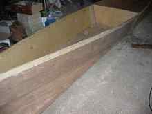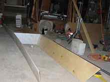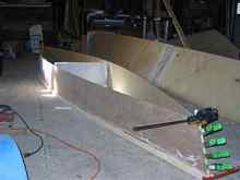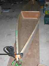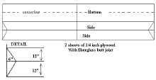 First I drew lines down the length of the plywood dividing it into long 12-inch wide strips. Two of these are cut off to form the sides, and the stem angles are formed by marking the bottom 6 inches back from the bow and drawing the diagonal. Plans? Naaaah..