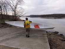 I put in at Arena on the Lower Wisconsin River for a quick test. My brother Jamie was kind enough to assist and take some photos. I'm a relative canoe novice, so here I am gingerly finding my way forward. This pirogue seems about as stable as the few canoes I've been in. (Meaning not very.)