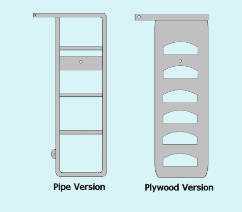 No room on the stern so the closest thing to an original idea I had was for a boarding ladder. I came up with a variation on the pivoting leeboard and built a pivoting ladder mounted the same way. The ladder and leeboard are interchangeable and can be mounted on either side. This has not been tested yet. The idea is that if you and your crew are swimming, one can hold down the side opposite the ladder while the other climbs on board. Then the second swimmer can dive under or swim around to the ladder while the first to board sits opposite to hold things down. Testing will determine if/how it will work with only one on board. Maybe because of the 5 foot bottom…or maybe use a drogue? One final thought; in case your leeboard got damaged perhaps slipping a sail bag over the boarding ladder would enable a sailor to sail to windward using it as an emergency leeboard.