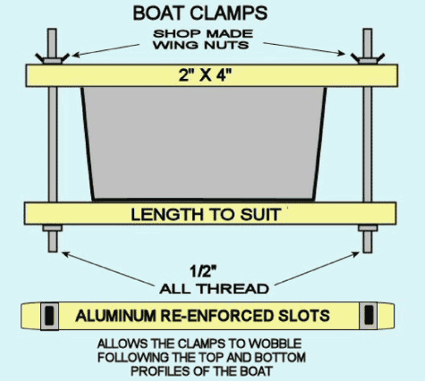 My boat is built right side up, unlike most sharpies, so I came up with a clamping system for forcing both the gunnels down and the bottom up at the same time. The idea is to move the clamps along a few inches at a time (working from the middle towards both ends) tack welding the bottom and gunnels to the sides. Then go back and continuously weld all the seams water tight. After tacking the boat can be picked up and tilted every which way for gaining optimum welding positions.